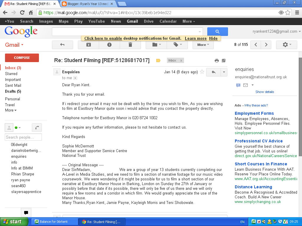 We have had another difficulty filming at our original intended location, Valentines Mansion, as the building is currently under renovation and parts of it are unsafe to the general public. When we first heard about this we decided that we should just find another building of heritage and see if we would be able to film there, there is only one other building of heritage near us which is Eastbury Manor House so we got in contact with them and asked if we would be able to film there. However we were soon informed that the Manor House was also closed and the next available date that we would be able to use it for filming would be on Saturday the 9th of February, this posed us with a problem as there was no doubt that it was far too long a time to wait to film. Much earlier in the planning process we came up with an idea which we could use should filming at the mansion fall through, the basis of the idea was to turn an art classroom into somewhat of an art gallery and film in there. As we were unable to film at both of the mansions we decided that we should revert to our back plan, we will be filming it on Wednesday 23rd January.